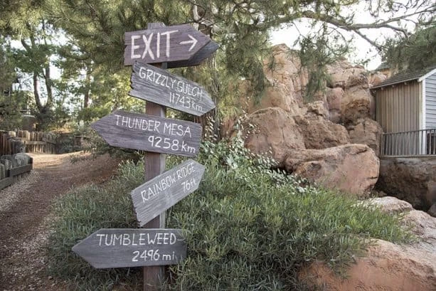 In Rainbow Ridge, there is a sign providing to different locations in the Big Thunder Mountain Railroad franchise. One of these towns is Grizzly Gulch.
