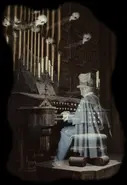 The Doom Buggies then enter the circular Seance Room. In the center of the room, a crystal ball containing Madame Leota’s head floats mysteriously above a table. Floating objects and instruments respond to Leota's incantations while a wispy green specter roams in a corner of the room. A raven can be seen perched on the back of the chair at the table. A book containing Leota's incantations is open with the pages flipped to 1313. Page 1312 shows an image of a figure reminiscent to the Hatbox Ghost.