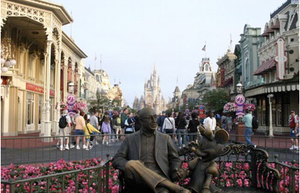 Main Street is designed to seem the entrance to a new show, Magic Kingdom's intention. The turnstiles are like the entry to a grand theater. Under the train station, posters of the park's attractions are shown to tell the guest what to expect and building the excitement. Then, the smell of fresh pop corn welcomes the guests as they enter the show.