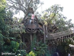 In February 1999, Disneyland closed its version of the Swiss Family Treehouse, and Imagineers re-themed the attraction to coincide with the soon to be released Tarzan film. The giant artificial tree received a comprehensive makeover, including 6,000 replacement vinyl leaves, a suspension bridge entrance from a new neighboring tree, and a variety of hands-on interactive features. The tree is currently 70 feet tall and weighs 150 pounds. On June 23, 1999, Tarzan’s Treehouse began welcoming park guests, just as Disney’s animated Tarzan premiered in movie theaters. Tributes to the Swiss Family Treehouse are featured in the attraction including the "Mind Thy Head" sign and the "Swisskapolka", which can be heard playing on a vintage gramophone.